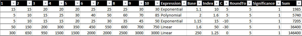 | Exponential | 15 | 150 | 1500 | 15000 | 1.5e+5 | 1.5e+6 | 1.5e+7 | 1.5e+8 | 1.5e+9 | 1.5e+10 |